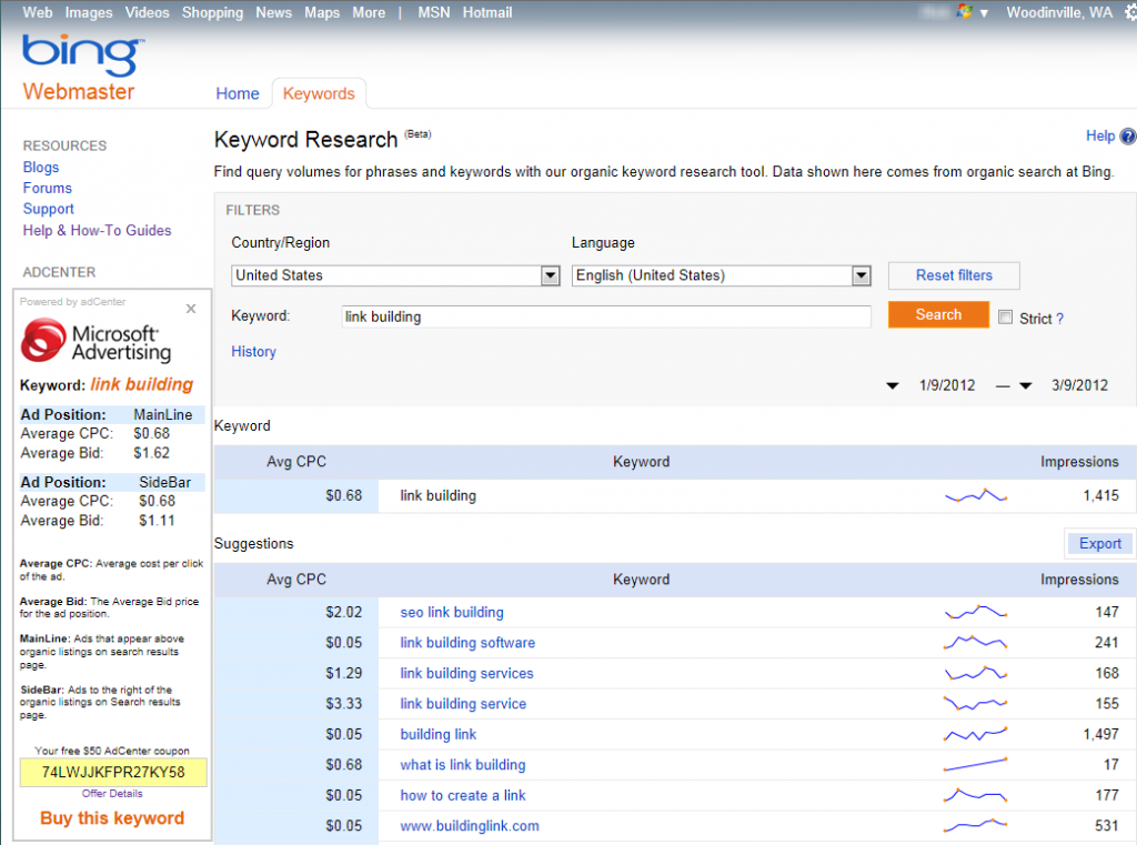 Adcenter Keyword Suggestion Tool – 必应Bing的关键词检索量查询/关键词推荐工具