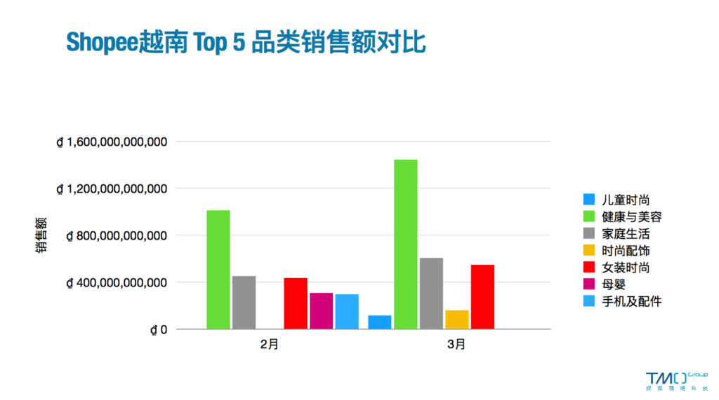 - 3月期间,越南的儿童时装、印尼的电子以及书和文具品类的销量均大幅度提高,4月初回落到正常范围内。但是3月相关品类的销售额变化却不大,说明在此期间,这些品类在Shopee网站上的促销力度较大,触发消费者进行购买。
